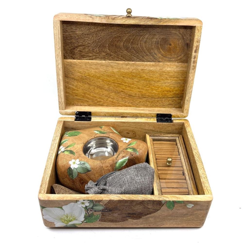 طقم يحتوي على صندوق خشب طبيعي طوله 26 سنتمتر عرضه 18 سنتمتر و ارتفاعه 10.5 سنتمتر عليه طباعة يدوية + مبخر فريد خشب طبيعي مزدوج و يمكن استخدامه مع فتيل عود أو مع الفحم , عليه طباعة يدوية ... + 40 فتيل عود + ولاعة و فحم